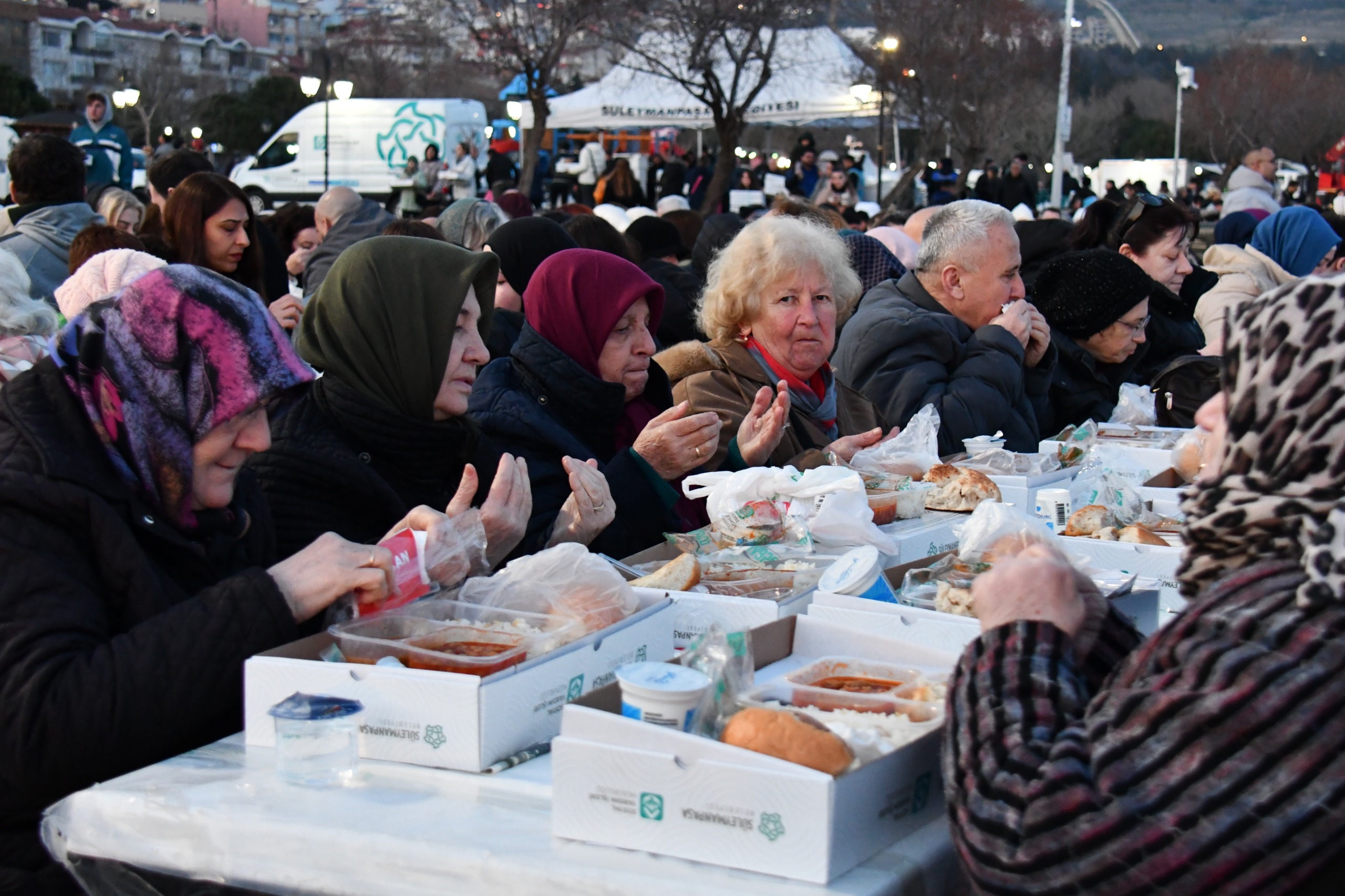 Alanı hınca hınç dolduran binlerce vatandaş, akşam ezanının okunmasıyla birlikte ellerini semaya açarak dualar etti. Süleymanpaşa Belediyesi Aşevi tarafından özenle hazırlanan 4 çeşit sıcak yemekle oruçlarını açan Süleymanpaşalılar, Ramazan ayının bereketini hep birlikte aynı sofrada paylaşmanın mutluluğunu yaşadı.